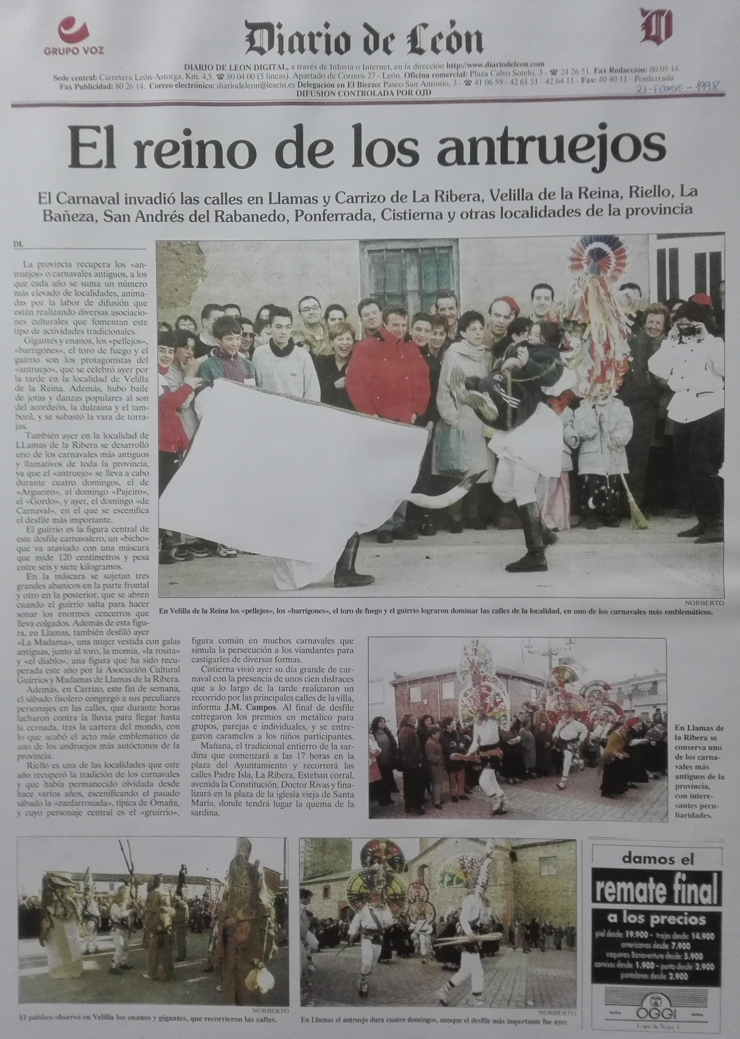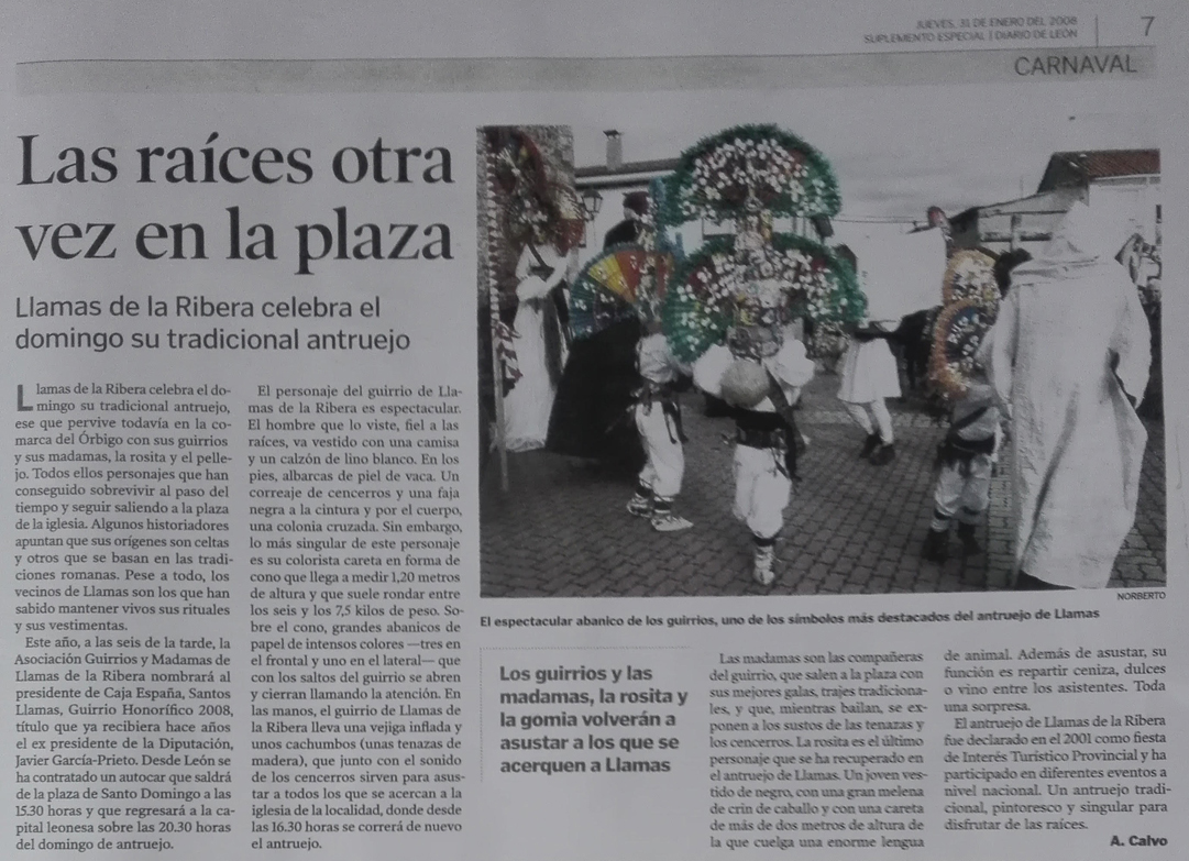 - 19/02/2023 – Llamas de la Ribera, entre madamas, guirrios y tradiciones ancestrales. La localidad ribereña corrió el ‘Antruejo’ este domingo, una celebración que está declarada de Interés Turístico Provincial. La Nueva Crónica.