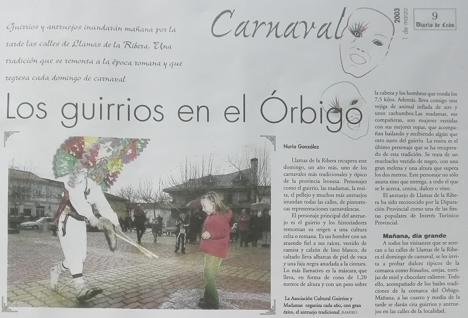 - 03/03/2003 – El domingo más gordo. Llamas de la Ribera vivió ayer por todo lo alto el día grande de su ancestral y colorista antruejo. Vecinos y visitantes disfrutaron como las fuerzas del bien, representadas por los guirrios, volvieron a imponerse al mal, encarnado. Diario de León.